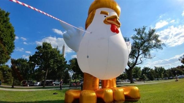 Έναν απρόσμενο «επισκέπτη» δέχτηκε ο Λευκός Οίκος. Το ύψος του: 7 μέτρα! Πρόκειται για μία κότα με χρυσαφένια μαλλιά και οργισμένη έκφραση, που θυμίζει... Ντόναλντ Τραμπ.